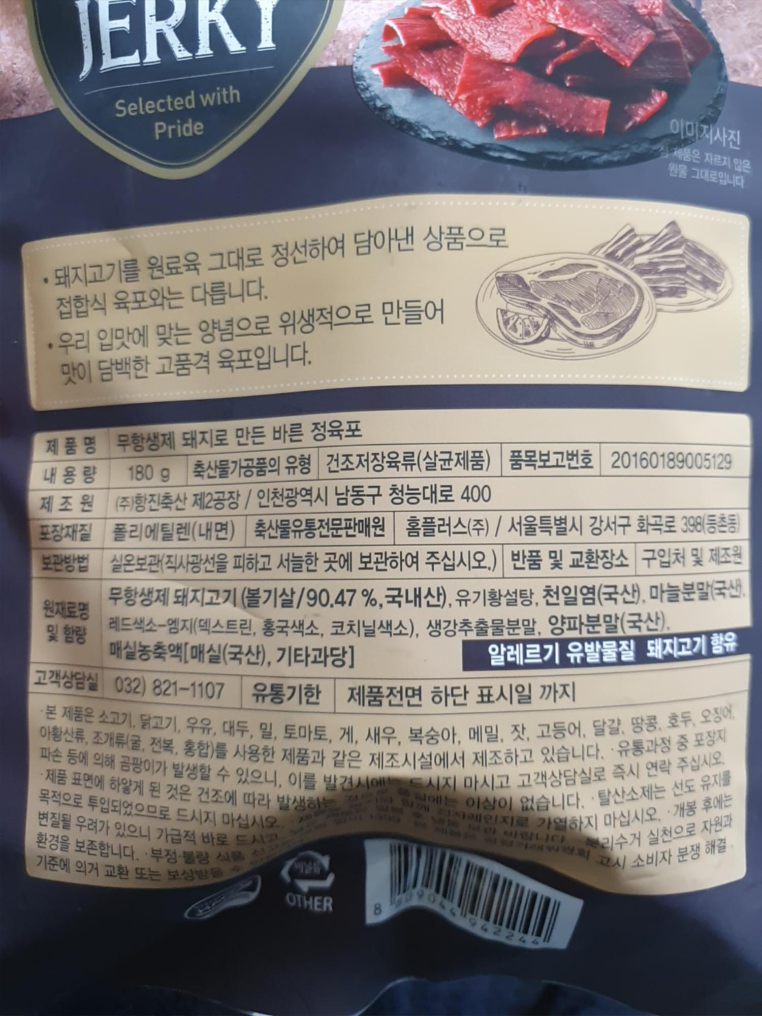 그런데 돼지로 만든 육포? 소육포만 보다가 돼지 육포는 처음이라 소와 돼지 중 돼지를 구매했다. 그리고 이건 다른 말이긴 한데 저 포장 외관이 너무 잔인하다는 생각이 들었다. 친구로 만든 육포를 바라보는 돼지들이라니! ㅋㅋㅋ 나는 닭이 치킨 광고를 하는 거도 잔인하다고 생각했는데 실물 사진이다 보니 갑자기 신경쓰인다.