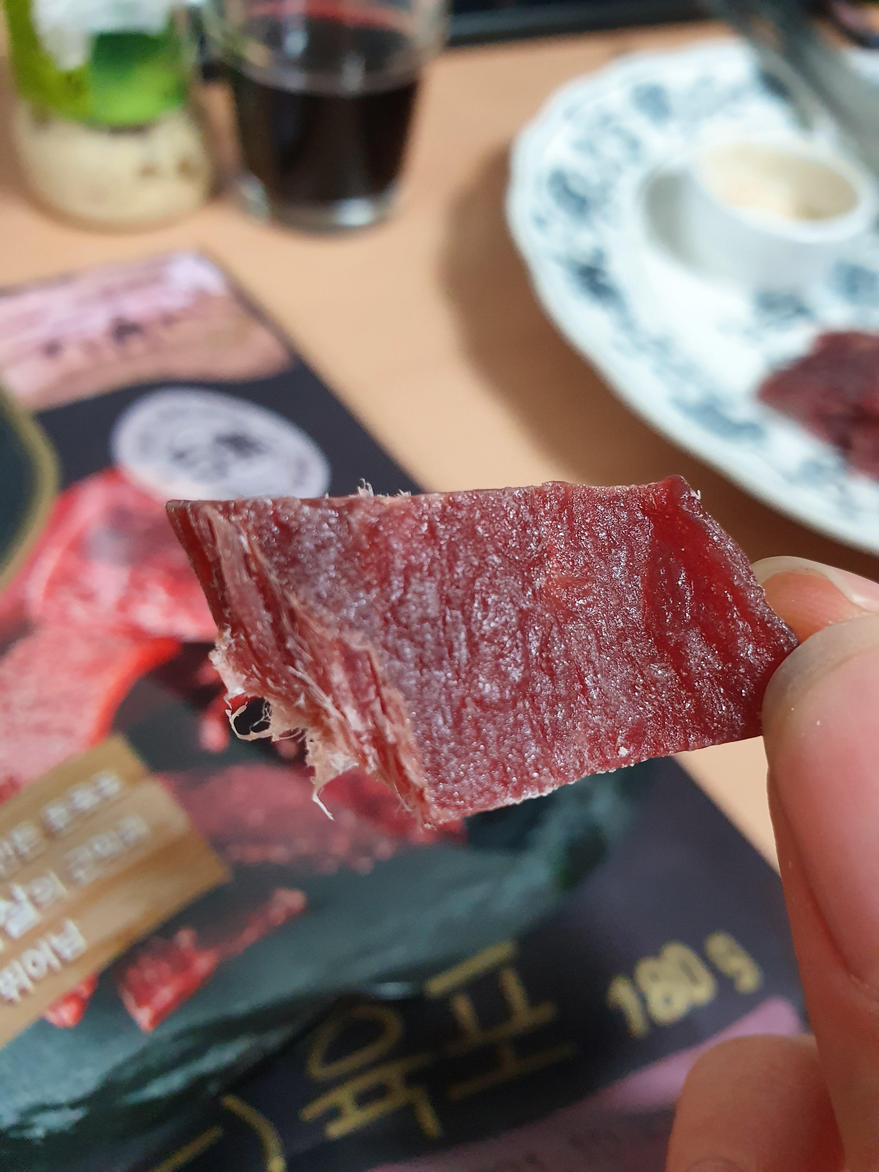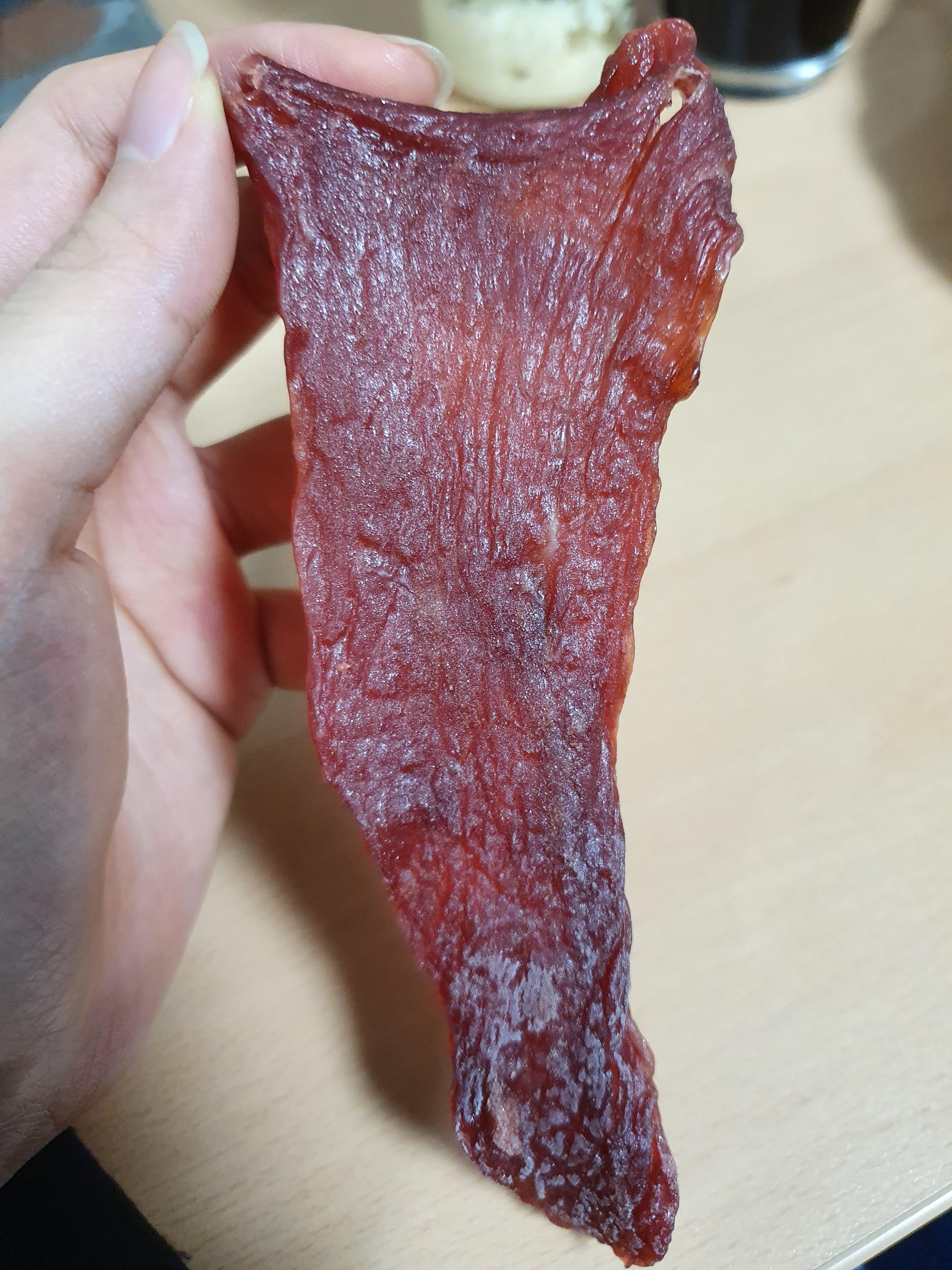 맛은 역시나 평범. 육포 맛이 거기서 거기지. 적절히 짠 맛에 이에 많이 끼지 않은 점이 괜찮았다. 그렇지만 특별하게 맛있고 그렇진 않다.